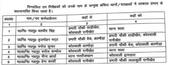 वरिष्ठ पुलिस अधीक्षक अल्मोड़ा देवेन्द्र पींचा द्वारा जनपद में पुलिसिंग और कानून व्यवस्था को थानाध्यक्षों/चौकी प्रभारियों के तबादले किए गए हैं। साथ ही नवसर्जित कोतवाली सोमेश्वर,द्वाराहाट व चौखुटिया में प्रभारी निरीक्षकों को जिम्मेदारी सौपी गयी।