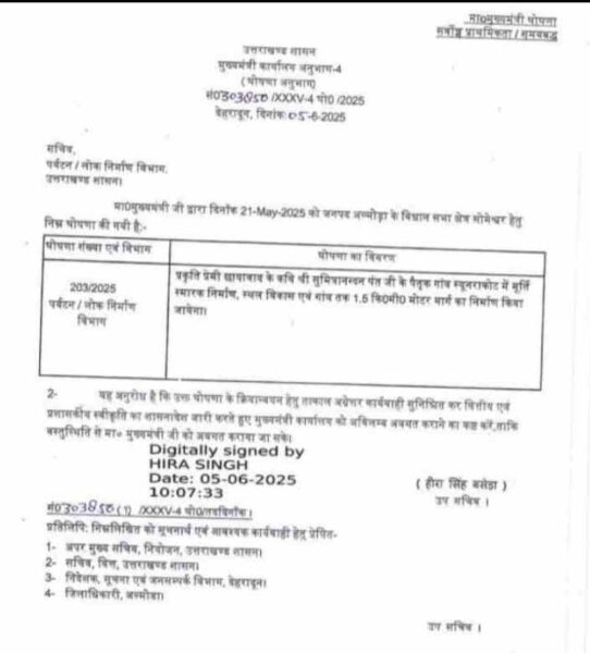 मुख्यमंत्री पुष्कर सिंह धामी की घोषणा संख्या 203 के तहत प्रकृति के सुकुमार कवि सुमित्रा नंदन पंत के पैतृक गांव के लिए 1.5 किमी मोअर मार्ग निर्माण, स्यूनराकोट में मूर्ति स्मारक निर्माण और स्थल विकास की घोषणा की गई है।