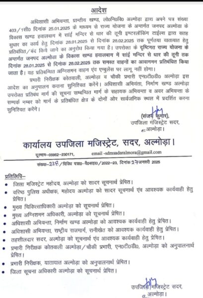 अल्मोड़ा: साईबाबा मंदिर से धार की तूनी मार्ग एक माह तक और बंद रहेगा। 28 फरवरी तक इस मार्ग को यातायात और सभी वाहनों के आवागमन के लिए पूर्णतया बंद किया जाएगा।