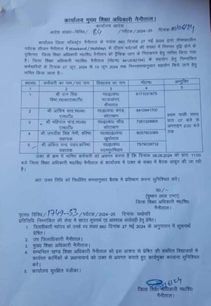 आदेश में आगे कहा गया है कि ”उक्त के क्रम में नामित कर्मचारी को अवगत करना है कि दिनांक 06.06.2024 को प्रातः 11:00 बजे जिला शिक्षा अधिकारी मा०शि० नैनीताल के कार्यालय में उक्त के संबंध में बैठक आहूत की जा रही है।