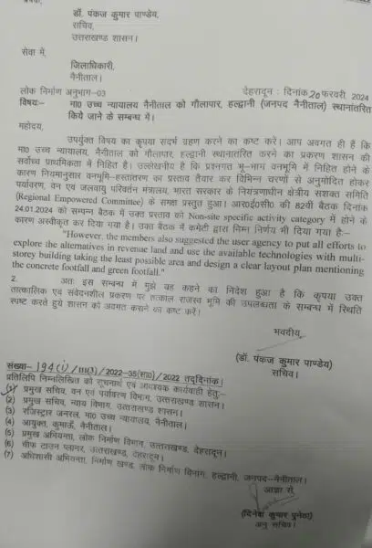 पत्र में कहा गया है कि ” उपर्युक्त विषय का कृपया संदर्भ ग्रहण करने का कष्ट करें। आप अवगत ही हैं कि मा० उच्च न्यायालय, नैनीताल को गौलापार, हल्द्वानी स्थानातंरित करने का प्रकरण शासन की सर्वोच्च प्राथमिकता में निहित है। उल्लेखनीय है कि प्रश्नगत भू-भाग वनभूमि में निहित होने के कारण नियमानुसार वनभूमि-हस्तांतरण का प्रस्ताव तैयार कर विभिन्न चरणों से अनुमोदित होकर पर्यावरण, वन एवं जलवायु परिवर्तन मंत्रालय, भारत सरकार के नियंत्रणाधीन क्षेत्रीय सशक्त समिति (Regional Empowered Committee) के समक्ष प्रस्तुत हुआ।”