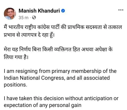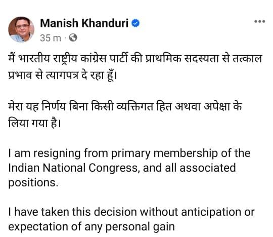 मनीष खंडूरी ने अपने सोशल मीडिया के माध्यम से अपने इस्तीफे की जानकारी दी।