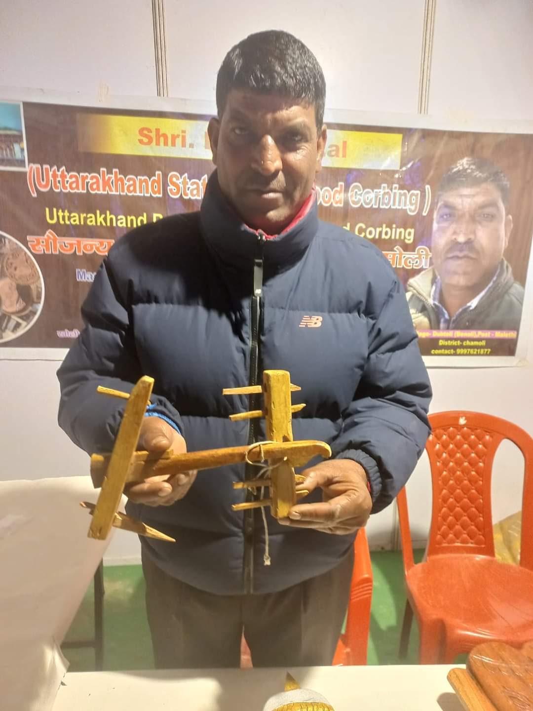 सीमांत चमोली जिले के बैनुली-दुग्तोली निवासी वुड कार्बर यानी लकड़ी पर नक्काशी करने वाले 48 वर्षीय दर्शन लाल से मेरी मुलाकात सोशल बलूनी पब्लिक स्कूल में आयोजित लोक विरासत में हुई। दर्शन के हाथों में जादू है। उनकी बनाई कलाकृतियां सजीव लगती है। त्यूण की लकड़ी से उन्होंने रोटाना के ठप्पे से लेकर चाकुला, पीढ़े, दुल्हन डोली, शिव मूर्ति, लाट-निसुड़ा और छोटा सा हल बनाया हुआ था। उनके स्टॉल पर में कला के कद्रदान खूब आए। दर्शन के अनुसार दो दिन में लगभग 15 हजार रुपये की सेल हुई और लगभग दो लाख रुपये के आर्डर मिले हैं।