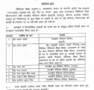 उत्तराखंड के सात मेडिकल कॉलेजों में स्थाई प्राचार्यों की तैनाती कर दी गई है, डीपीसी के पश्चात शासन में पदोन्नति प्रदान कर सूची जारी कर दी है।
