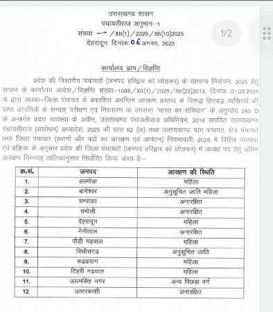अभी अभी अल्मोड़ा उत्तराखंड जिला पंचायत अध्यक्षों का अंतिम आरक्षण जारी, यह रही लिस्ट अल्मोड़ा महिलाबागेश्वर महिला (एससी)चंपावत अनारक्षितचमोली अनारक्षितदेहरादून महिलानैनीताल अनारक्षितपौड़ी महिलापिथौरागढ़ अनुसूचित जातिरुद्रप्रयाग महिलाटिहरी महिलाउधमसिंह नगर ओबीसीउत्तरकाशी अनारक्षित editor1 6 Aug, 20259:04 PM Final reservation of district panchayat presidents released अल्मोड़ा महिलाबागेश्वर महिला (एससी)चंपावत अनारक्षितचमोली अनारक्षितदेहरादून महिलानैनीताल अनारक्षितपौड़ी महिलापिथौरागढ़ अनुसूचित जातिरुद्रप्रयाग महिलाटिहरी महिलाउधमसिंह नगर ओबीसीउत्तरकाशी अनारक्षित Read More बड़ी खबर – उत्तराखंड में 10 साल सेवा करने वाले संविदा कर्मचारी होंगे नियमित, आदेश जारीBy editor1 5 Dec, 2025#ट्रेंडिंग हैशटैग:Final reservation of district panchayat presidents released Post navigation Previous Previous post: रामनगर में बारिश से टूटी उम्मीदें,गर्जिया मंदिर के पास कोसी ने सब कुछ बहा दिया, छीन गया दुकानदारों की जिंदगी का सहाराNext Next post: अल्मोड़ा:: कोसी नदी में बहा अधेड़ तलाश जारी