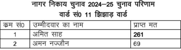 दोनो ने अपना चुनाव सीधे मुकाबले में जीता और दोनों के सामने केवल एक ही प्रतिद्वंदी मौजूद था। निर्वाचन आयोग के आंकड़ों के मुताबिक दोनों ने ही 261-261 मत हासिल किए हैं। अमित ने 261 मत हासिल कर झिझाड़ वार्ड से अमन नज्जौन को हराया तो उनकी पत्नी ज्योति ने 261 मत प्राप्तकर पांडेखोला वार्ड से धीरज कुमार पांडे को पराजित किया।