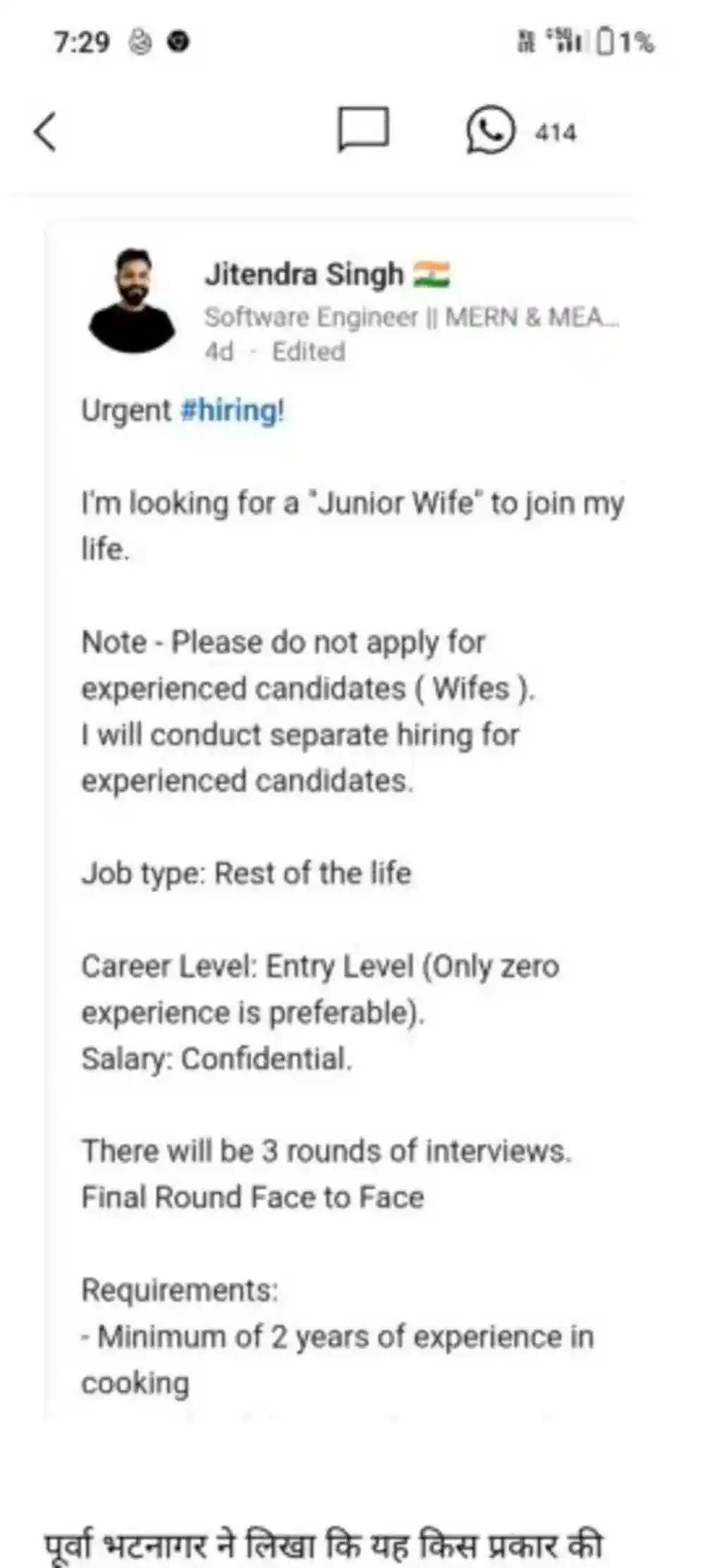 पेशे से सॉफ्टवेयर इंजीनियर जीतेन्द्र सिंह ने लिंक्डइन पर एक पोस्ट किया कि वह एक जूनियर पत्नी की तलाश कर रहे हैं। उन्होंने लिखा कि मैं अपने जीवन के लिए एक जूनियर पत्नी की तलाश कर रहा हूं। कृपया अनुभवी उम्मीदवारों (पत्नियां) आवेदन न करें। मैं अनुभवी लोगों के लिए अलग से भर्ती आयोजित करूंगा।