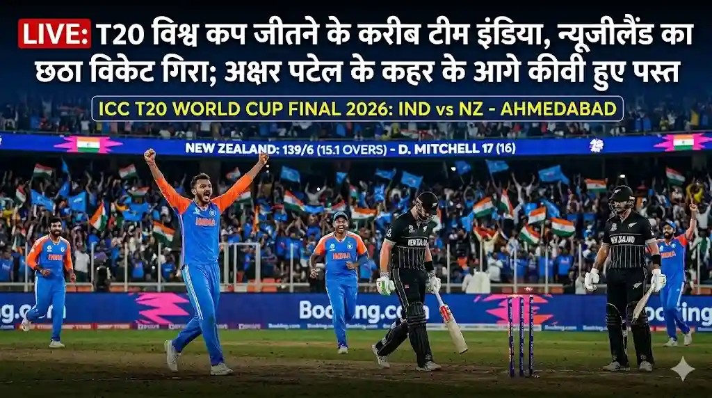 अहमदाबाद (8 मार्च 2026): नरेंद्र मोदी स्टेडियम में नीली जर्सी का समंदर उमड़ पड़ा है। भारत अपने दूसरे टी20 विश्व कप खिताब को चूमने से महज कुछ ही कदम दूर है। 256 रनों के पहाड़ जैसे लक्ष्य का पीछा करने उतरी न्यूजीलैंड की टीम भारतीय स्पिन और रफ्तार के आगे पूरी तरह बेबस नजर आ रही है। ताजा समाचार लिखे जाने तक न्यूजीलैंड की टीम 15 ओवरों में 6 विकेट के नुकसान पर 139 रन बना चुकी है।