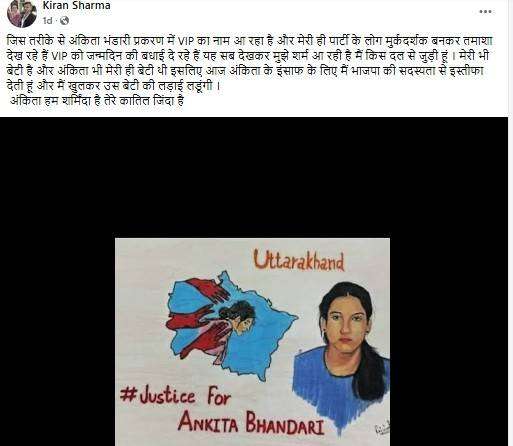 किरण शर्मा ने फेसबुक पोस्ट में लिखा कि उनकी पार्टी के लोग मूकदर्शक बनकर तमाशा देख रहे हैं और एक कथित वीआईपी को जन्मदिन की बधाई दे रहे हैं। उन्होंने लिखा कि यह सब देखकर उन्हें शर्म महसूस हो रही है कि वह किस दल से जुड़ी हुई हैं। उनका कहना है कि इस तरह का रवैया न केवल पीड़िता के प्रति असंवेदनशील है, बल्कि समाज के लिए भी गलत संदेश देता है।