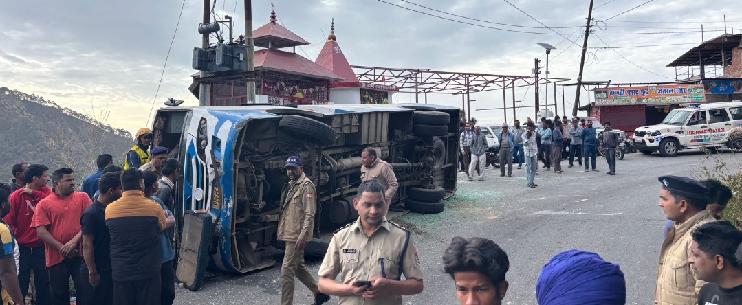 सड़क हादसा: भूमियाधार खूपी के पास सड़क में पलटी केएमओ बस,1 की मौत,7 घायल
