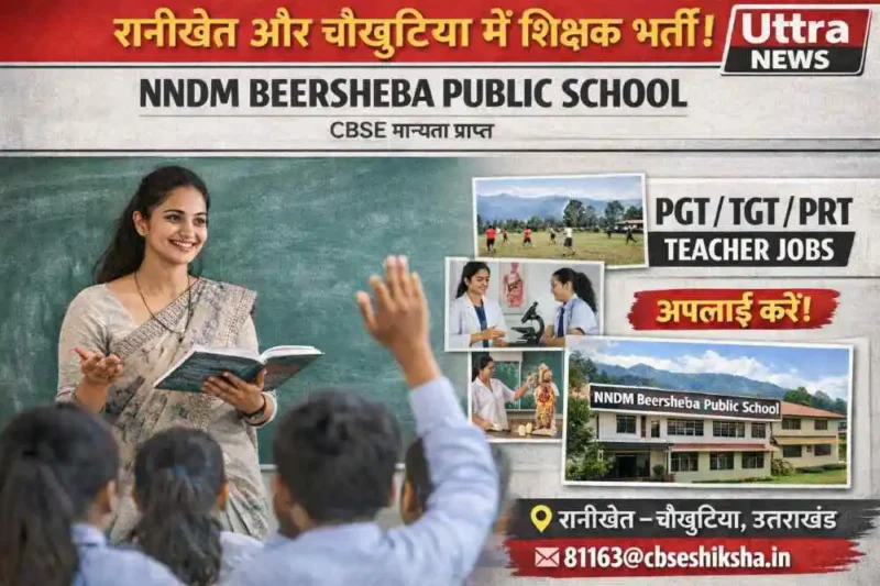 अल्मोड़ा/रानीखेत। अगर आप अल्मोड़ा जिले के रानीखेत (Ranikhet) या चौखुटिया (Chaukhutiya) के आसपास रहते हैं और टीचिंग के क्षेत्र में अपना करियर बनाना चाहते हैं, तो यह खबर आपके लिए खुशियों की सौगात लेकर आई है। सीबीएसई (CBSE) से मान्यता प्राप्त प्रतिष्ठित संस्थान NNDM बीरशिवा पब्लिक स्कूल (NNDM beersheba Public School) में नए शैक्षणिक सत्र 2026–27 के लिए शिक्षकों की भर्ती प्रक्रिया शुरू कर दी गई है।