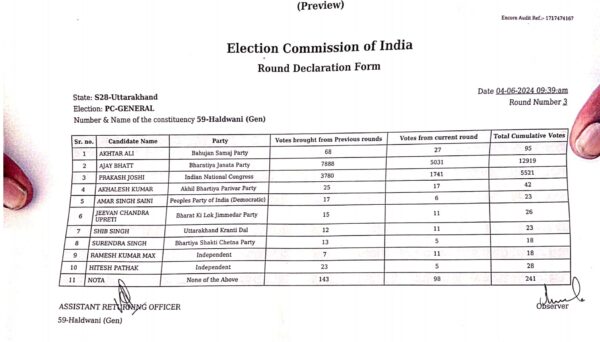 उत्तराखंड में 5 लोकसभा सीटों पर तीसरा राउंड समाप्त हो चुका है। जिसमें बीजेपी आगे नजर आ रही है। कांग्रेस का खाता खुलता नजर नहीं आ रहा है। देखिए